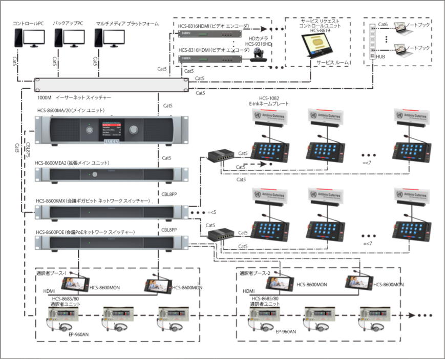 各ターミナルは会議メインユニットHCS-8600MA/20に接続された会議ギガビット ネットワークスイッチャーHCS-8600KMXを介して接続します。