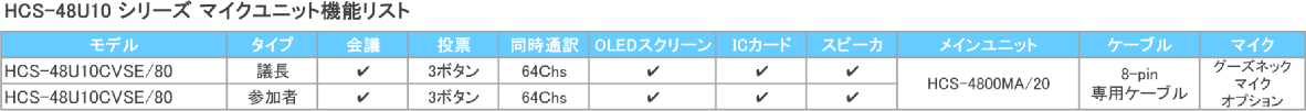 | HCS-48U6/80 シリーズ 会議マイクユニット(埋込式) 会議テーブルを効率よく使用できるスタイリッシュ なデザインで効率的な会議運営で必要とする特長を備えています。 各モジュールの組合せで構成できるマイクユニットはマイクOn/Offボタンと優先ボタン(議長ユニットのみ)モジュールを ベースに必要に応じて3投票キー、64チャンネル同時通訳チャンネルセレクター モジュールを追加します。 マイクエレメントや長さの異なるグーズネックマイク(別売)が利用でき最適な音声の収音でき、参加者へは明瞭度のある高音質を提供します。 HCS-48U6CMICM/80 議長マイクユニット (会議、HCS-48U6VOTTW投票ユニットおよびHCS-48U6SPKスピーカパネル接続可) HCS-48U6DMICM/80 参加者マイクユニット (会議、HCS-48U6VOTTW投票ユニットおよびHCS-48U6SPKスピーカパネル接続可) HCS-48U6CMICS 議長マイクユニット (会議、HCS-48U6SELM/80 64チャンネルセレクター必須) HCS-48U6DMICS 参加者マイクユニット (会議、HCS-48U6SELM/80 64チャンネルセレクター必須) HCS-48U6DVOTTW 投票ユニット (3投票キー、非接触ICカードリーダー、HCS-48U6SELM/80 64チャンネルセレクター、HCS-48U6MICM/80 マイクユニット必須) HCS-48U6SELM/80 埋め込み式64チャンネルセレクター (HCS-48U6MICS マイクユニット、HCS-48U6DVOTTW 投票ユニット、HCS-48U6SPK埋め込み式スピーカパネル接続可) HCS-48U6SPK埋め込み式スピーカパネル (HCS-48U6SELM/80 埋め込み式64チャンネルセレクター、HCS-48U6MICM/80マイクユニット必須) |
