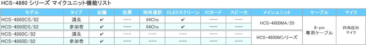 HCS-4860/82シリース 会議ユニット 大型16mm金メッキダイアフラム、高性能エレクトレットコンデンサーマイクは、 ピッチ角度が調整できる耐久性のある金属製の四角柱形デザインです。 クリアーな状態表示にデュアルカラーLEDインディケータを備えています。 128x36OLED画面は正確なチャンネルと通訳言語情報を提供します。 20Hz〜20KHzと特性を持ち最大64の同時通訳チャンネルをサポートします。 マイクのゲインとEQ(5バンド)は個別に調整でき完璧な音質が提供できます。 HCS-4860CS_B/82 議長マイクユニット (会議、64Ch同時通訳、OLD画面) HCS-4860DS_B/82 参加者マイクユニット(会議、64Ch同時通訳、OLD画面) CS-4860C_B/82 議長マイクユニット (会議) HCS-4860D_B/82 参加者マイクユニット (会議) |