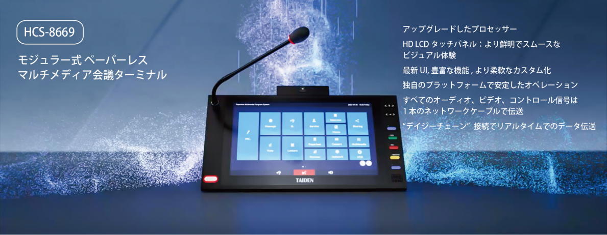 | HCS-8669 シリーズモジュール式ペーパーレスマルチメディア会議ターミナル 独自のモジュラー デザインを特長とするターミナルはマイク、投票、スピーカ、カメラなどの機能モジュールを組合せて構成します。 HD静電容量式タッチスクリーンの14インチ 1920x1080LCDはスムースな操作ができるマルチタッチです。 5メガピクセル マグネットカメラは便利性とスムースな会議運営をサポートします。 |