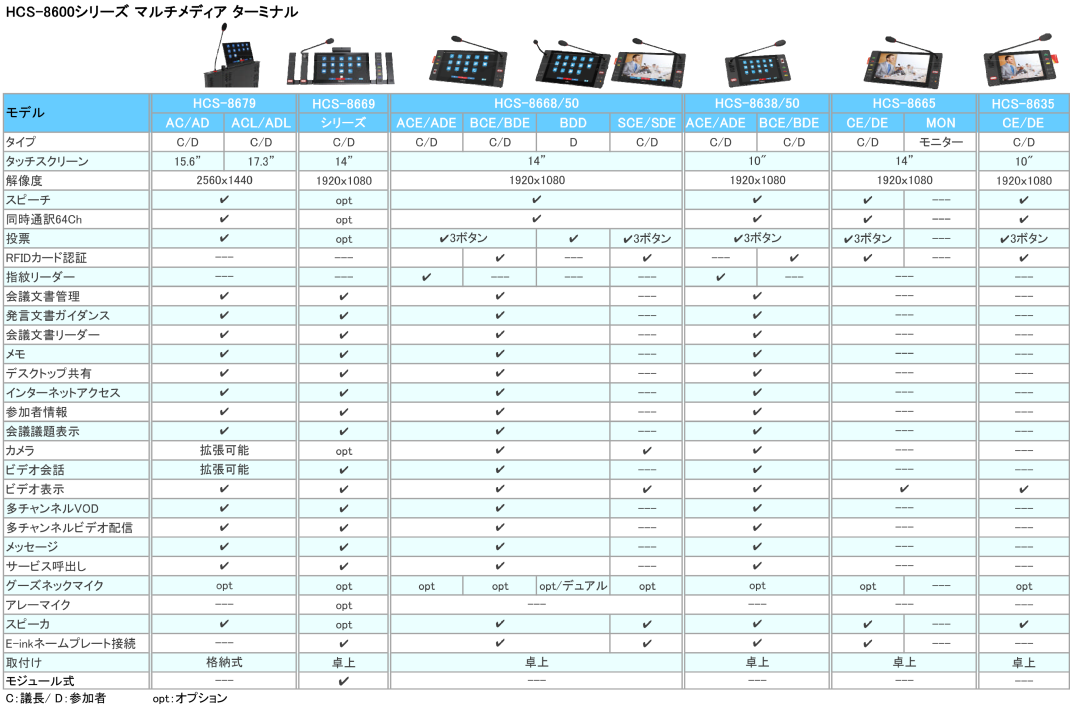 | ・ 15.6" と17.3” 2560x1440HDLCDタッチ パネル ・ 艶消しガラス、眼の保護、無反射、防指紋 ・ 格納式スクリーン デザイン、自動On/Off ・ グーズネックマイクは独立して昇降 ・ スピーチ、投票、64Ch同時通訳そして全てのチャンネルは20Hz〜20KHzの広帯域高音質を提供 ・ 格納コントロール、言語切替え用の1.3"タッチ スクリーン ・ アクティブ スタイラスペンをサポート(HCS-8679PEN) ・ HDカメラ、ビデオ スイッチャーの使用で自動カメラ追尾 |