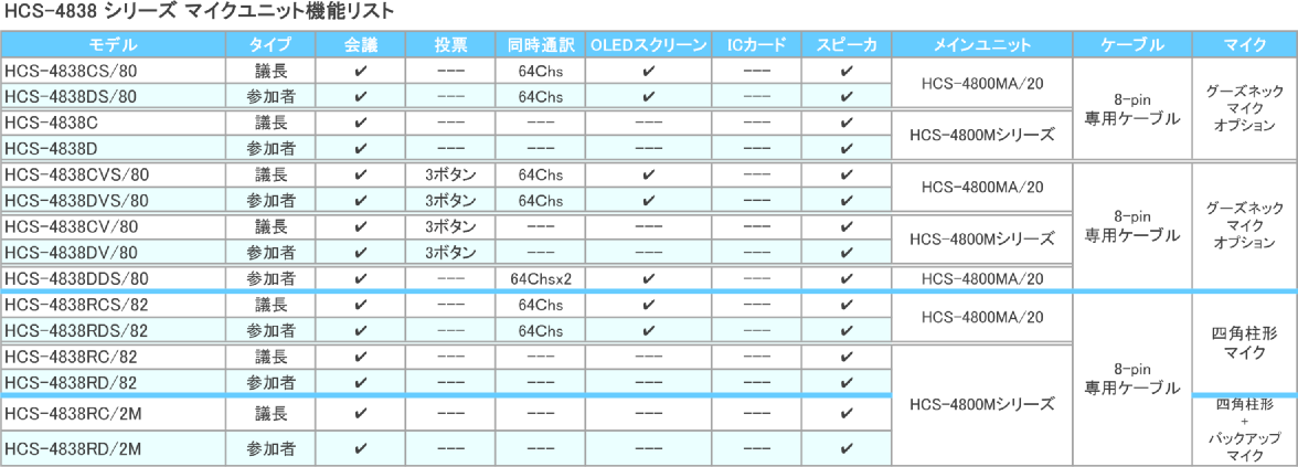 HCS-4838/80 シリーズ 会議ユニット (投票/同時通訳チャンネルセレクター付)/(投票) 投票ボタン、通訳言語名と番号が表示される128x36OLED画面、同時通訳の64(1+63)チャンネルを サポートするチャンネル セレクターを装備しています。 全てのチャンネルは20Hz〜20KHzの広帯域特性を備え、内蔵の高性能HiFiスピーカにより高い明瞭度と高音質を提供します。 パネル部にはブライユ点字表示があり視覚障害のあるユーザーを支援しています。 さらにマイクエレメントや長さの異なるグーズネックマイク(別売)が利用でき、 最適な音声の収音が確保できます。 HCS-4838CVS/80 議長マイクユニット(会議、3投票ボタン、64Ch同時通訳チャンネルセレクター、OLED画面) HCS-4838DVS/80 参加者マイクユニット(会議、3投票ボタン、64Ch同時通訳チャンネルセレクター、OLED画面) HCS-4838CV/80 議長マイクユニット(会議、3投票ボタン) HCS-4838DV/80 参加者マイクユニット(会議、3投票ボタン) |