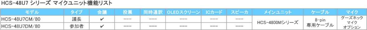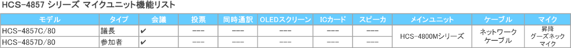 | HCS-48U6/80 シリーズ 会議マイクユニット(埋込式) 会議テーブルを効率よく使用できるスタイリッシュ なデザインで効率的な会議運営で必要とする特長を備えています。 各モジュールの組合せで構成できるマイクユニットはマイクOn/Offボタンと優先ボタン(議長ユニットのみ)モジュールを ベースに必要に応じて3投票キー、64チャンネル同時通訳チャンネルセレクター モジュールを追加します。 マイクエレメントや長さの異なるグーズネックマイク(別売)が利用でき最適な音声の収音でき、参加者へは明瞭度のある高音質を提供します。 HCS-48U6CMICM/80 議長マイクユニット (会議、HCS-48U6VOTTW投票ユニットおよびHCS-48U6SPKスピーカパネル接続可) HCS-48U6DMICM/80 参加者マイクユニット (会議、HCS-48U6VOTTW投票ユニットおよびHCS-48U6SPKスピーカパネル接続可) HCS-48U6CMICS 議長マイクユニット (会議、HCS-48U6SELM/80 64チャンネルセレクター必須) HCS-48U6DMICS 参加者マイクユニット (会議、HCS-48U6SELM/80 64チャンネルセレクター必須) HCS-48U6DVOTTW 投票ユニット (3投票キー、非接触ICカードリーダー、HCS-48U6SELM/80 64チャンネルセレクター、HCS-48U6MICM/80 マイクユニット必須) HCS-48U6SELM/80 埋め込み式64チャンネルセレクター (HCS-48U6MICS マイクユニット、HCS-48U6DVOTTW 投票ユニット、HCS-48U6SPK埋め込み式スピーカパネル接続可) HCS-48U6SPK埋め込み式スピーカパネル (HCS-48U6SELM/80 埋め込み式64チャンネルセレクター、HCS-48U6MICM/80マイクユニット必須) |
